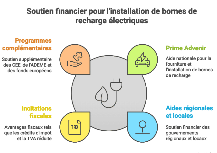 Les aides publiques peuvent être combinées, dans la limite de 80 % du coût total. Le cumul entre la Prime Advenir, une aide régionale et un crédit d’impôt est possible, sous réserve de conditions précises.